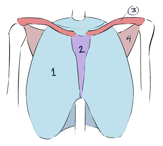 http://p1-tt.byteimg.com/large/pgc-image/14f09259a3de4f18872e532dd90f3f5e?from=pc胸骨(2)在前面闭合该结构,并与脊柱一起创建一条将身体分为两部分的假想线。使用它们作为指导!
