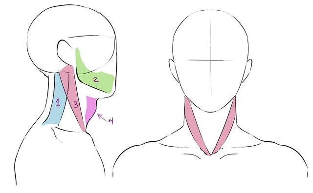 在颈部,颈椎(1)恰好位于颚(2)的后面。有各种各样的肌肉可以操纵头部的运动。最明显的是一个非常非常长的名字(胸锁乳突肌!),但是您可以通过其V形(从耳朵到锁骨中央分开)轻易地识别它(3)。这些肌肉的中央是亚当的苹果,它在男性中尤为突出(4)。