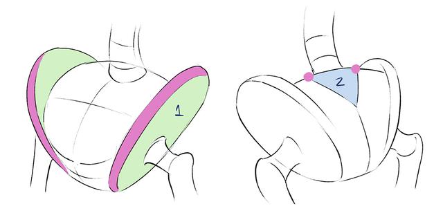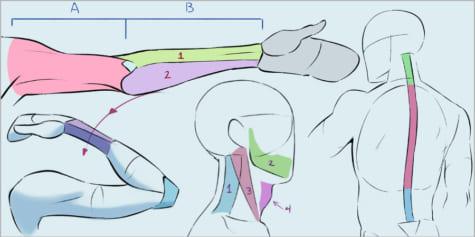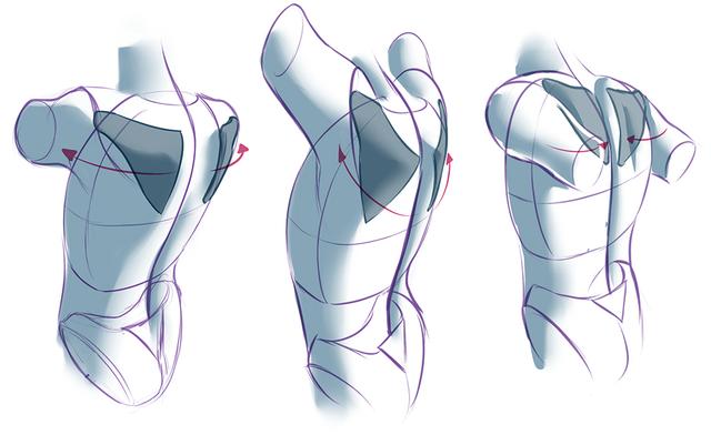 背脊是连接到手臂的部分。您可以通过多种方式绘制它,我喜欢给它一个类似于肋骨(1)形状的卵形形状。