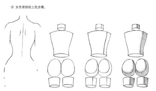 http://p1-tt.byteimg.com/large/pgc-image/5a6327ab3bfb434b85cd23659c9342f1?from=pc人体的背部也可以简化理解为几何体的组合.如图中的几何体简化圈所示。然后按照几何体的明暗关系漆加阴影效果,同样要考虑到光的来源方向,