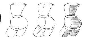 作品中没有明确光源时,可设定身体朝向的一方为光源的方向,如图中所示,假定光源来自图中的左前方,根据光照面积的假定绘出圆柱体中的明暗交界线.