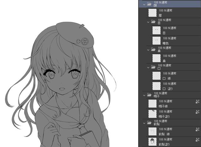 使用线条图图层作为参考图层,并使用填充工具对其进行填充。对于颜色,选择恰好在白色和黑色之间的灰色。如果将颜色滑块设置为“ HSV”并将V值设置为50%,它将为中间灰色。在调色板中注册很方便。
