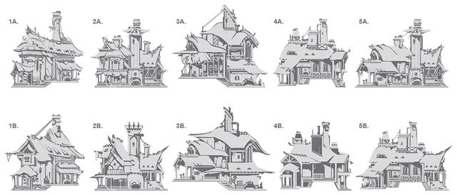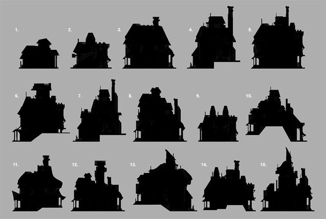 从刚才绘制的剪影中选出五个,一边留意主要构造和建筑物的各种要素,一边画上细节。虽然一开始先绘制从侧面看来的造型会让图像显得有些扁平,但这样做能在绘制建筑物的正面时激发更棒的点子。
