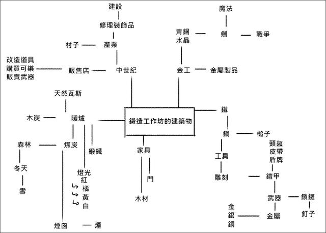 不论是哪一种企划,首先我都会进行脑力激荡的发想和主题分析。为了要设计以中世纪形象为基础的奇幻世界锻造工作坊,我会先调查锻造工作坊的功能并写下关键字,拓展灵感。
