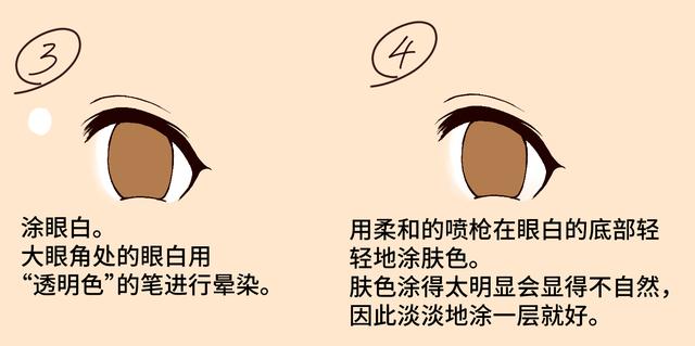 http://p6-tt.byteimg.com/large/pgc-image/7b0006a28d4049aba42176faae7e87ab?from=pc涂眼白。大眼角处的眼白用“透明色”的笔进行晕染。