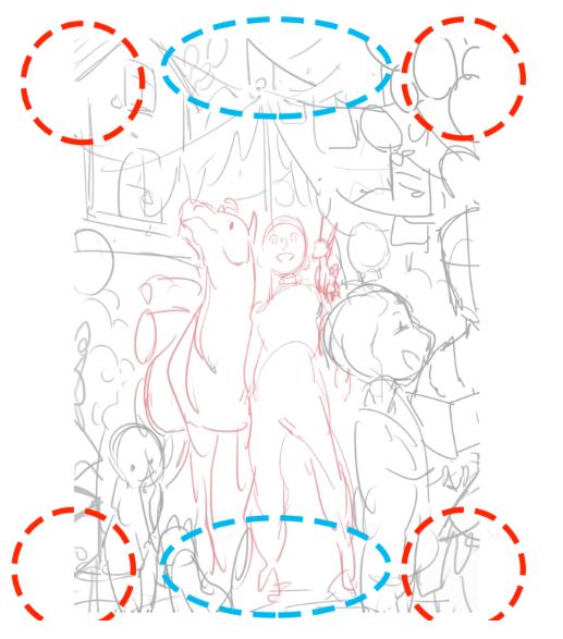 当屏幕的四个角都填满时,人们会感到局促。如果在一个角上有一个很少有元素的令人耳目一新的零件,那么视线自然会引导到它。这就是“失落的感觉”。检查屏幕顶部和底部以及四个角(蓝色虚线)的密度。上方和下方的阻塞元素也会导致头晕。