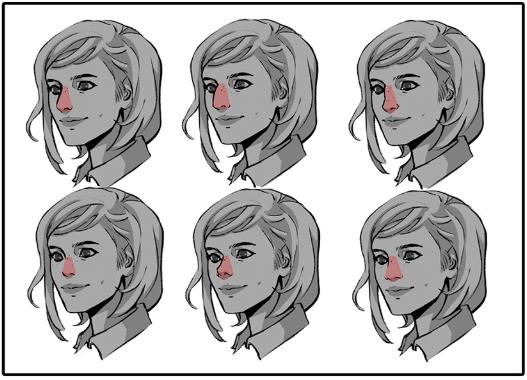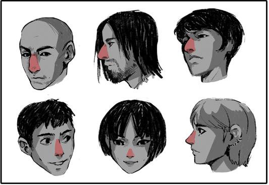 在下面的示例中,我决定为上方的三个字符绘制一个突出的鼻子,为下方的三个字符绘制一个小的鼻子。如前所述,角色的心理可以与身体特征(例如鼻子)紧密联系在一起,但总是有例外。
