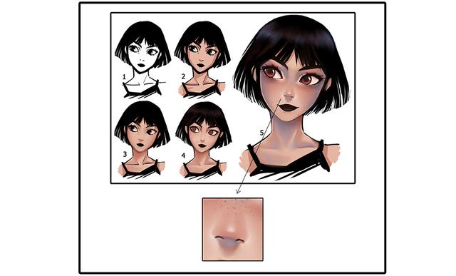 最后,通过逐步说明,您可以看到鼻子如何与构成面部的其他元素结合在一起。我画了一个有小雀斑的鼻子,使鼻子区域的皮肤有点质感。