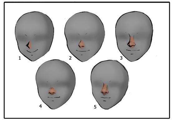 艺术家识别鼻子的方式不同,并根据其风格以不同的方式表达它们。这是鼻子表情的五个例子。第一个鼻子是简单的卡通风格,第二个鼻子是迪斯尼风格,第三个鼻子是美国漫画风格,第四个鼻子是我自己的风格(称为“时尚”),第五个鼻子更逼真/它以半现实风格绘制。