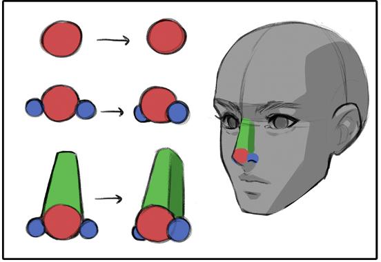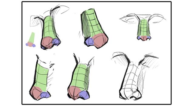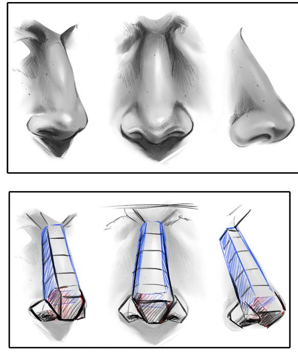 想象一下构成和拆卸鼻子的不同基本形状。使用扁平的矩形形状可以帮助您了解音量。