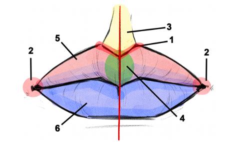 丘比特的弓(1),关节(或上下嘴唇的连接处)(2),骨(连接鼻子和嘴巴的皮肤)(3),中央结节(丘比特弓下方的嘴唇部分)(4),上唇(5) )和下唇(6)。