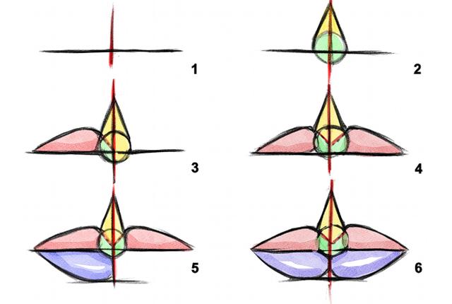 在下面的图片中,您可以看到如何逐步绘制嘴唇,从直线开始,使用不带透视图的圆形,弯曲和细长结构。另外,嘴唇的粗细,宽度和长度会根据您设计的字符类型而有很大差异。