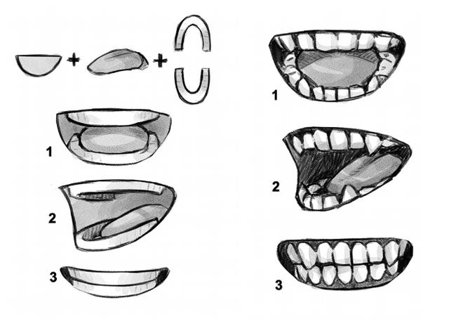 首先,让我们分析没有嘴唇的嘴巴,以更好地分析嘴巴的结构。