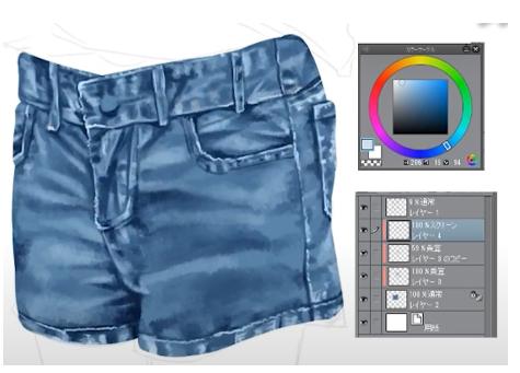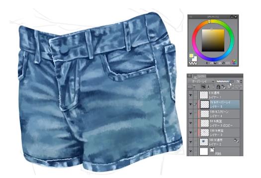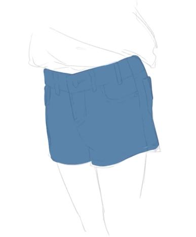 绘制粗糙后,在其下创建一个“标准层”,并用一种蓝色填充牛仔布部分的底部。对于线条绘制层,将不透明度降低到大约10%,以使线条不会被过度断言。