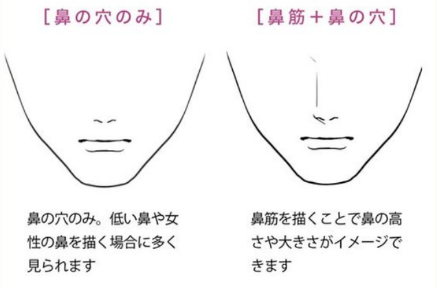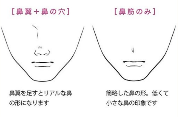 鼻子由鼻梁的鼻背、鼻尖的鼻尖、左右鼓起部分的鼻戴、鼻子两个孔之间的线条即鼻妆构成,在漫画中有部分描绘的倾向