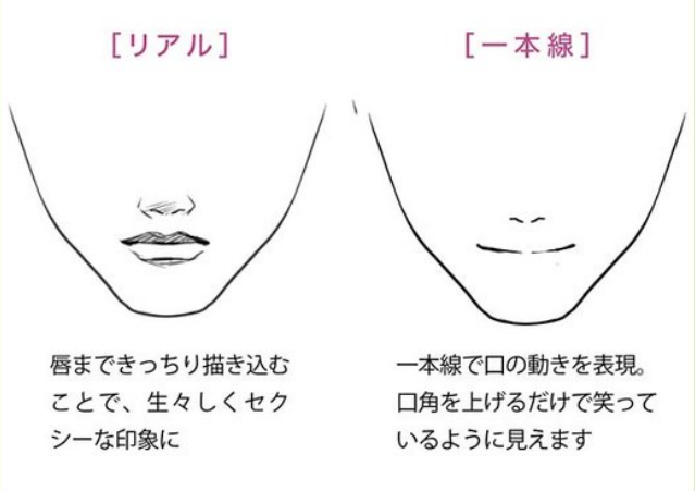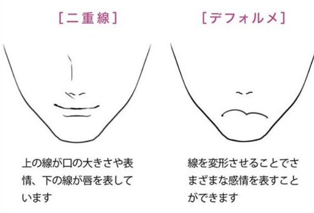 在漫画中,口有简化的倾向,也有只用线来表达的情况。考虑到眼睛和鼻子的平衡来区分画