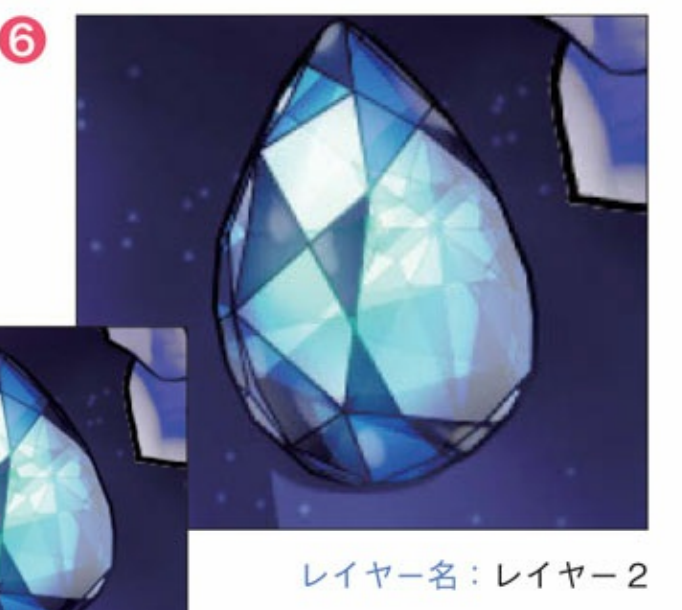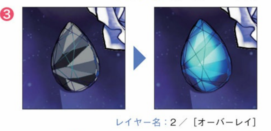 使用与额头上的水晶相同的颜色,沿着线条画在合成模式屏幕的图层中加入高光。切石的亮点是光的方向。