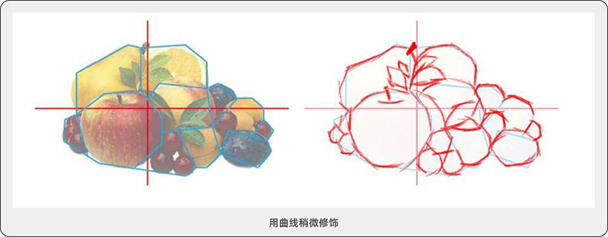 https://p3-tt.byteimg.com/origin/pgc-image/b68ca679549343838854749b0472e4f8?from=pc3、接下来,对应坐标,找每个水果的关键点,比如,苹果左右的最高低点、转折点。然后找上面梨左右的最高低点、转折点…… 这样对比着找形,如果苹果画大了,留给梨的空间变小了,这样观察让你的形越来越准。