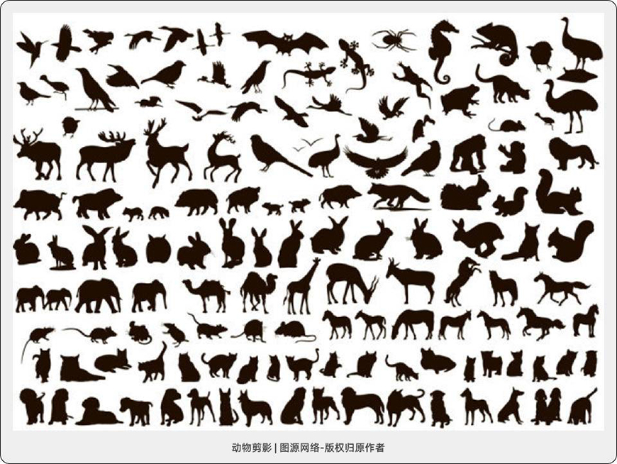 就像下面这些形状,什么细节也没有,只有个剪影,但是我们可以从剪影准确判断出它们是什么动物。因此,这里我们要记住:外轮廓的形状比一切轮廓和细节都更加重要。每次画画时,我们都要先看剪影形,看看像不像。