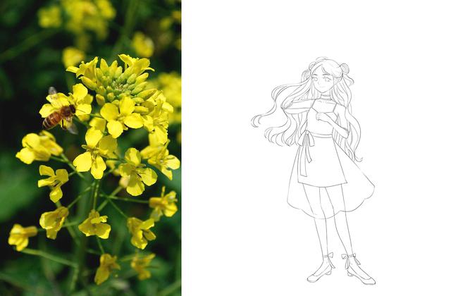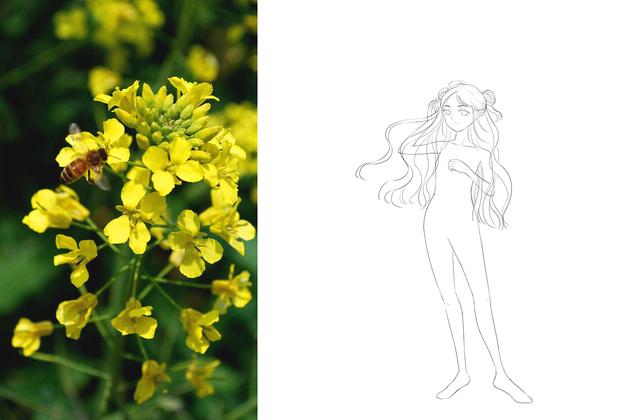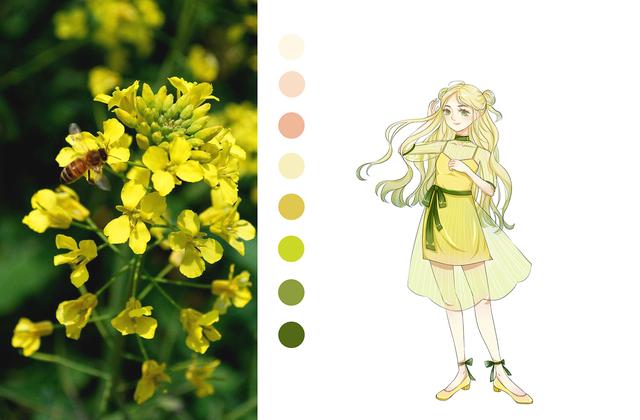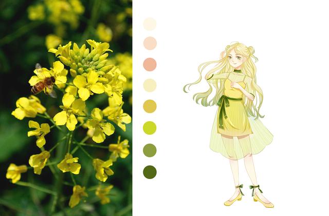 拟人作为插画中的一种修辞手法,可以很好的给我们提供灵感来源,通过提取参考物体的外形特征,配色感觉,还可以将参考物体作为图案纹样加入到我们的画面当中,拟人的手法非常适合画人设或者立绘之类的,那么这一次就带着大家一起来画一个油菜花拟人小姐姐。