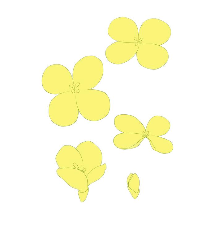 通过对油菜花的主要颜色,即黄色和绿色进行颜色提取,并且后期调整颜色的明度和饱和度,做出配色色卡,然后将搭配好的颜色平涂上去即可,涂色笔刷使用硬边圆。