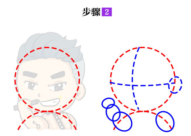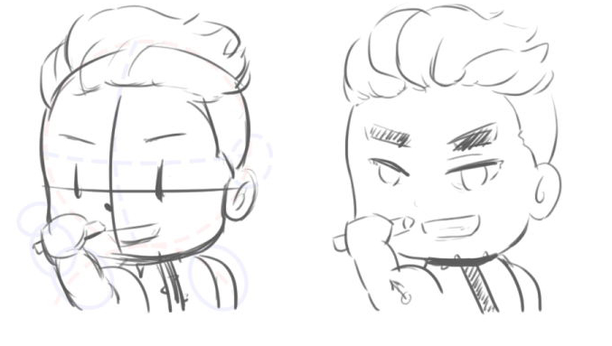 以这个肌肉男为例,比例大概- -头半身,因为是Q版所以我喜欢大脑袋,然后大概定一下五官线和动态线。