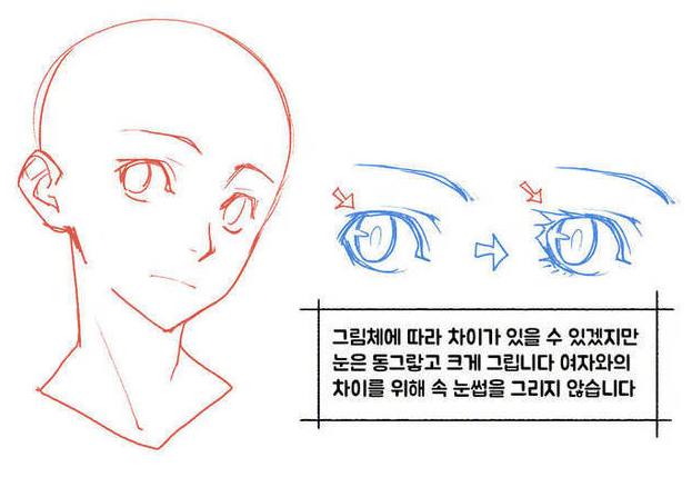 虽然根据图片的不同会有差异,但是眼睛画的又圆又大,为了和女人的差异不会画眼睫毛