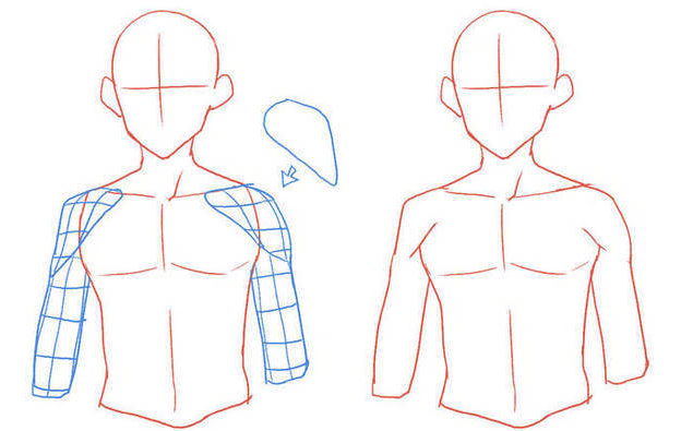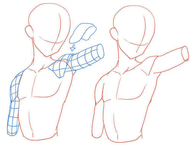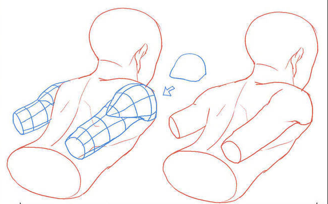 肩膀向上抬起胳膊的时候,要像上面一样,肩膀不是平面,而是立体地画出来。