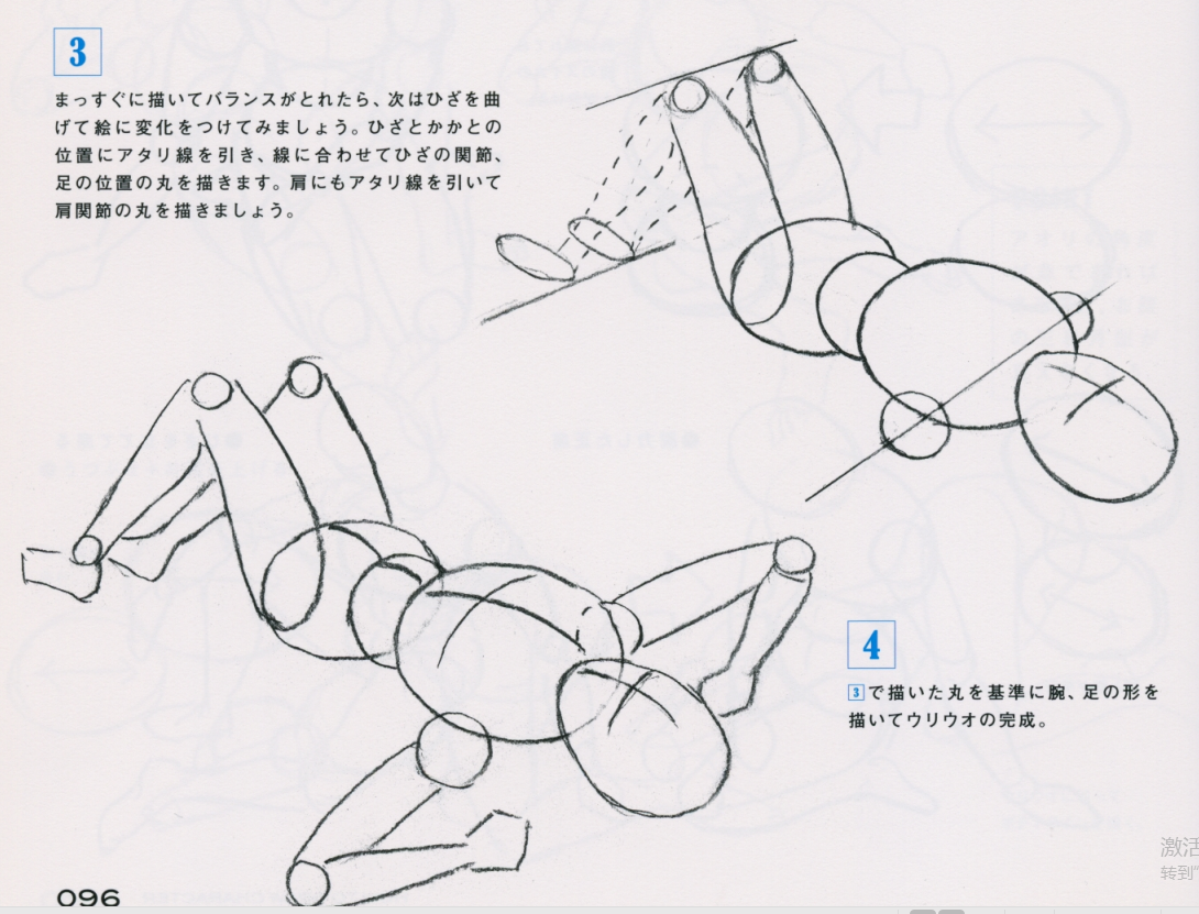 如果画得笔直,取得平衡的话,接下来就弯曲膝盖改变画的形状吧。在膝盖和脚后跟的位置画上连接线,配合线画出膝盖的关节和脚的位置的圆。肩上也画上ATARI线,画上肩关节的圆形。