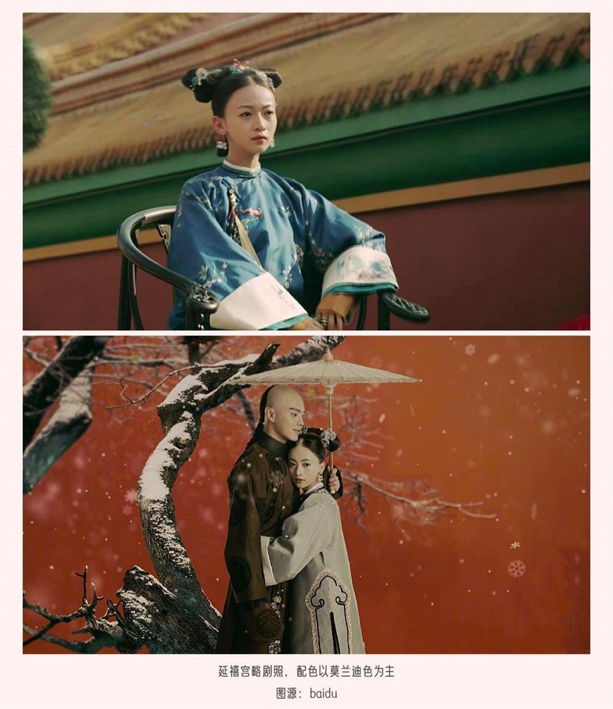 例如,追剧少女们都知道,早年间的古偶剧多用鲜艳的阿宝色来搭配,想拉近距离感。而这样的视觉冲击,却带来廉价与俗气的感觉。前两年的延禧宫略,于正摒弃过度鲜艳的配色,用起了经典的莫兰迪色,人眼前一亮,整部剧也显得高级起来。