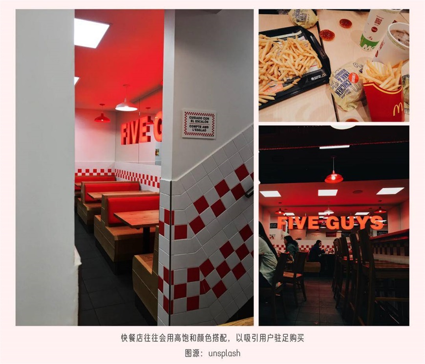 https://p6-tt.byteimg.com/origin/pgc-image/93eea965b7b6445b8f3a19026f460baf?from=pc日常中也不难发现,快餐店会使用高饱和的红/黄的搭配,刺激顾客食欲,也凸显出高性价比。