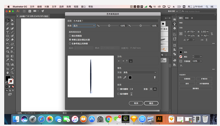 https://p6-tt.byteimg.com/origin/pgc-image/2a7598a19760487ea9753e7f10e5aac1?from=pc首先我们使用椭圆工具绘制一个像线条状的形状,然后拖进右边的画笔栏中,点选艺术画笔。之后画笔宽度调整压力,着色设置单色,笔尖方向朝下这样就能得到明显的笔触效果了。