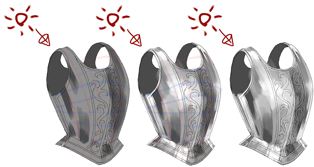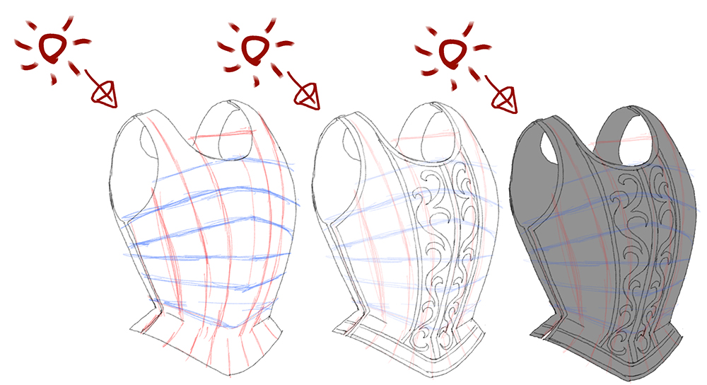在此盔甲上雕刻图案时,我绘制了红色和蓝色的网格作为“形状”指南。