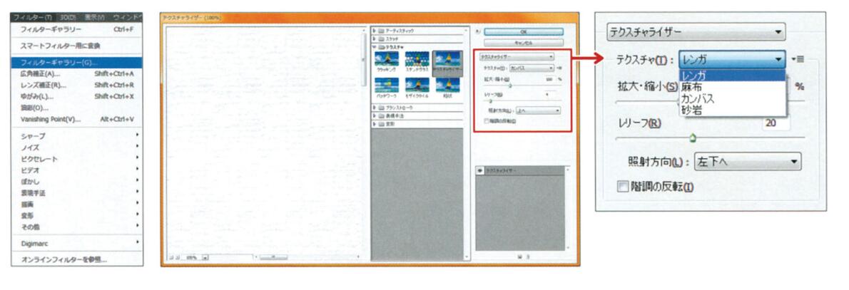 水彩上色中经常使用的工具之一还有【纹理素材】(在Photoshop中为【滤镜】)。这个工具在笔刷上色和厚涂中也会用到,还有模糊的功能。为表现素材质感而黏贴于画上的【纹理素材】在水彩上色中通常用于表现【纸张】的质感。—般在手绘的水彩上色中,会使用被称作【水彩