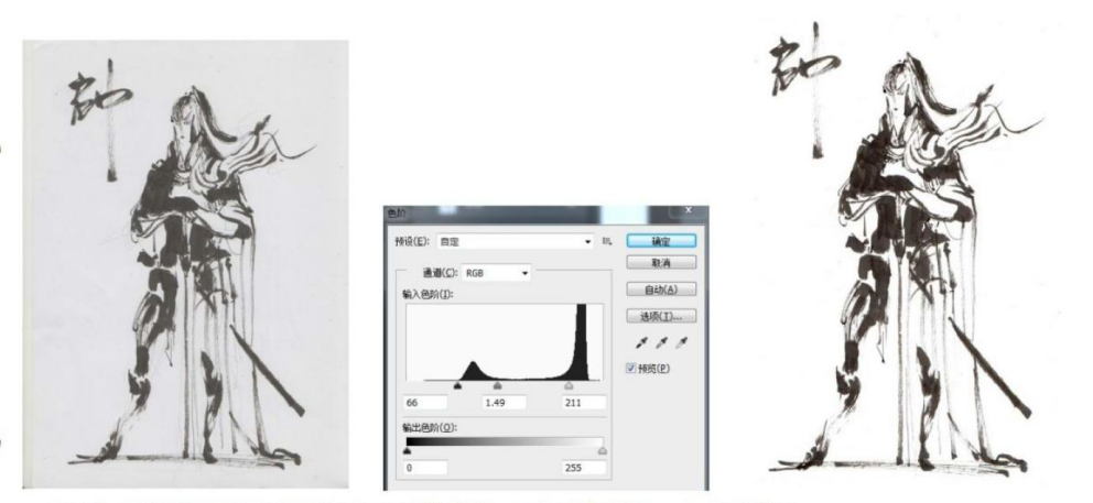 1、先将画好的图导入Photoshop中。按快捷键Ctrl+L,弹出“色阶”对话框,然后拉动图中3个滑块的位置来进行调节。