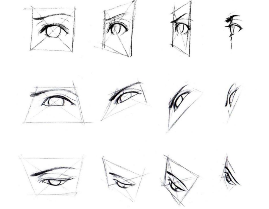 教程1先画出一个面,然后通过近大远小的原理画出这个面各个角度的透视,接着在这些透视面上塑造出眼睛。要表现好眼睛的透视,需要把上、下眼皮的弧度表现到位,同时也要注意眼珠的形状。