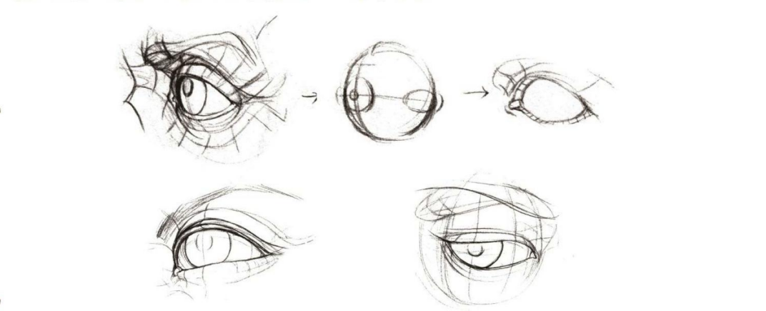 画眼睛的时候最重要的是把它看成一个球体,它主要是由眉弓骨、颧骨和鼻梁骨夹着,然后由眼轮匝肌围绕眼睛,构成眼皮,于是才形成我们看到的眼睛。画眼睛的时候最难的地方不是刻画眼珠,而是把握好眼睛的球体透视。