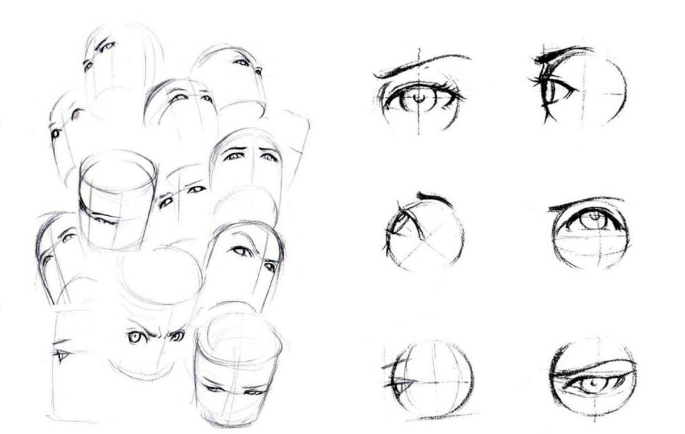 教程2先画出许多圆柱体,将其看成一张张脸。然后在上面画出表示为面部朝向的十字线,根据这些十字线找到眼睛的位置。感受在画两只眼睛的时候,眼睛的观察视线是否一致,以及其近大远小的关系是否正确。