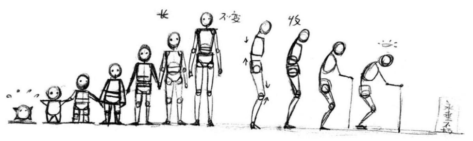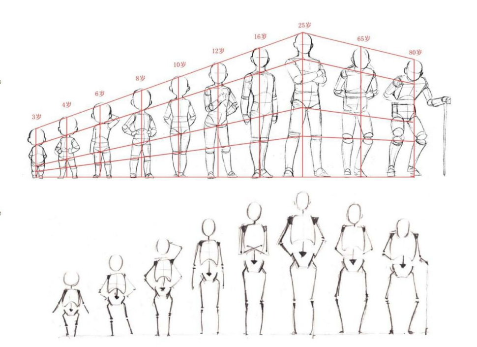 人体身型比例不是绝对的,会随着年龄段的改变而改变,其主要变化的特征为胯部底部的提高,以及上身和下身的增长。人到45岁之后身体的各部分功能就开始衰退,骨骼关节的软组织也开始硬化,呈现“逆生长”,总体来说,生长趋势就像─条抛物线,人物的头部在身体中占的比较越大就越年轻。