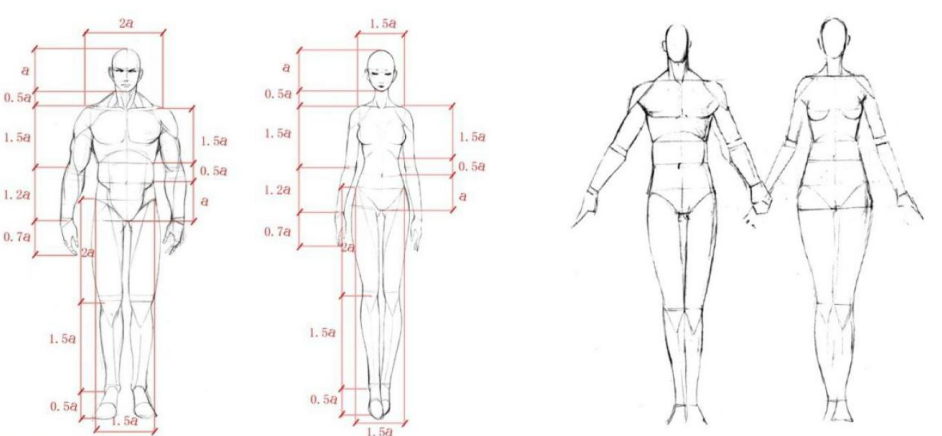 区别:女性肩宽1.5个头长 (1.5a),男性肩宽两个头长(2a );女性胯宽1.5个头长(1.5a ),男性胯宽1.2个头长( 1.2a )。