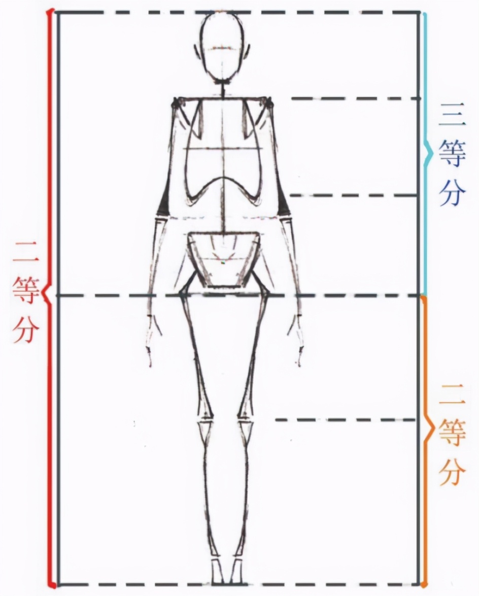 以成人身高的“火柴人”来讲解框架的比例关系,其划分的方法有两种:等比划分与单位划分。