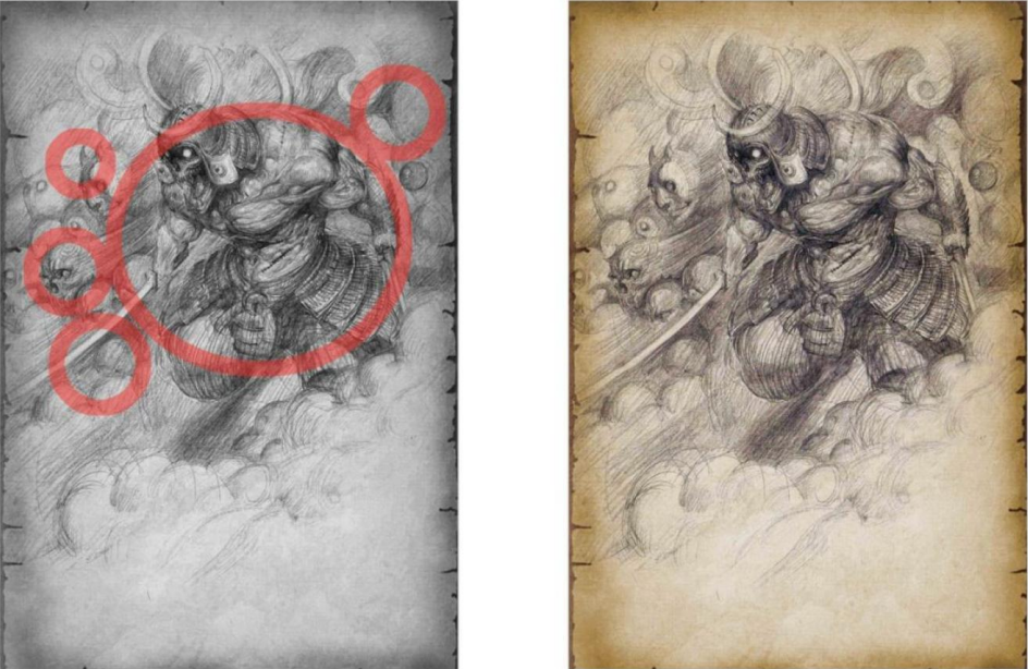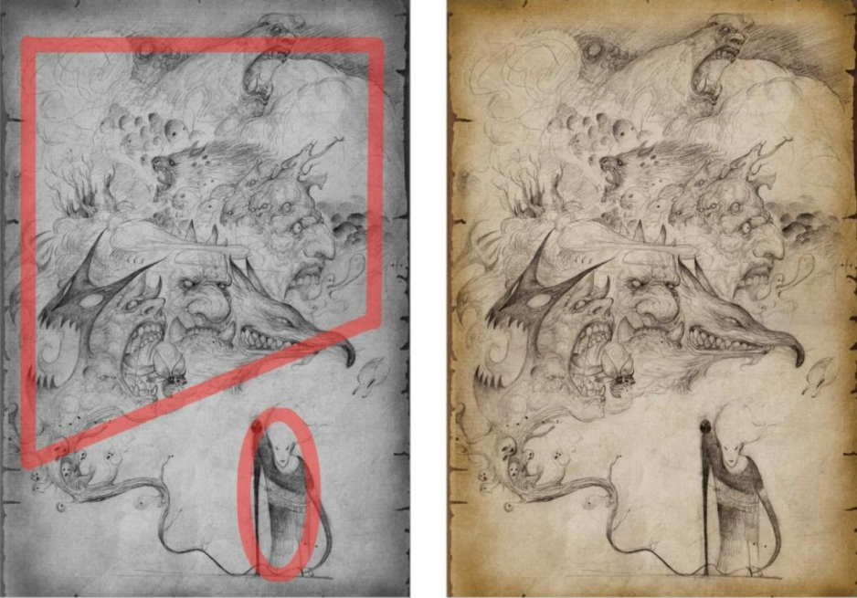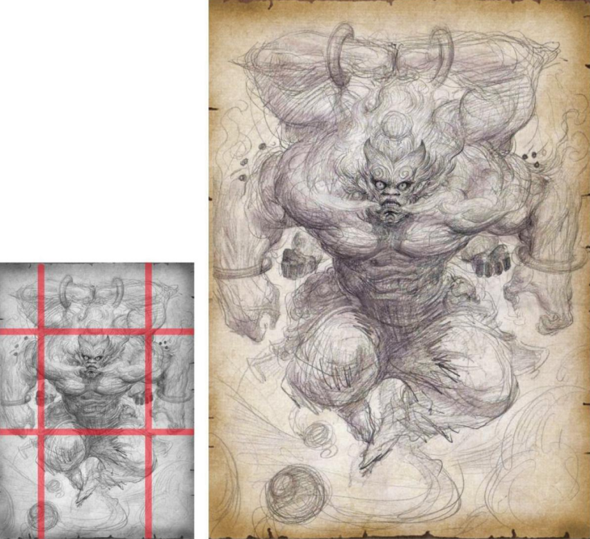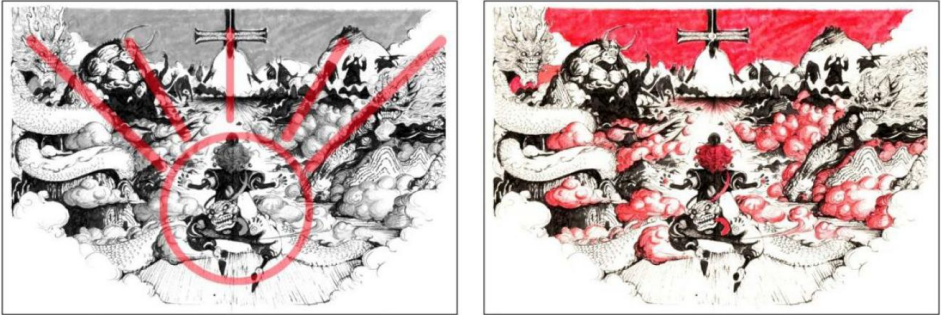 围绕型构图可以衬托出主体的存在感,使周围的元素围着主体进行展现,突出主体。在绘画BOSS时,这样可以很好地衬托出它是老大的感觉,同时周围的小点可以表现出画面故事。