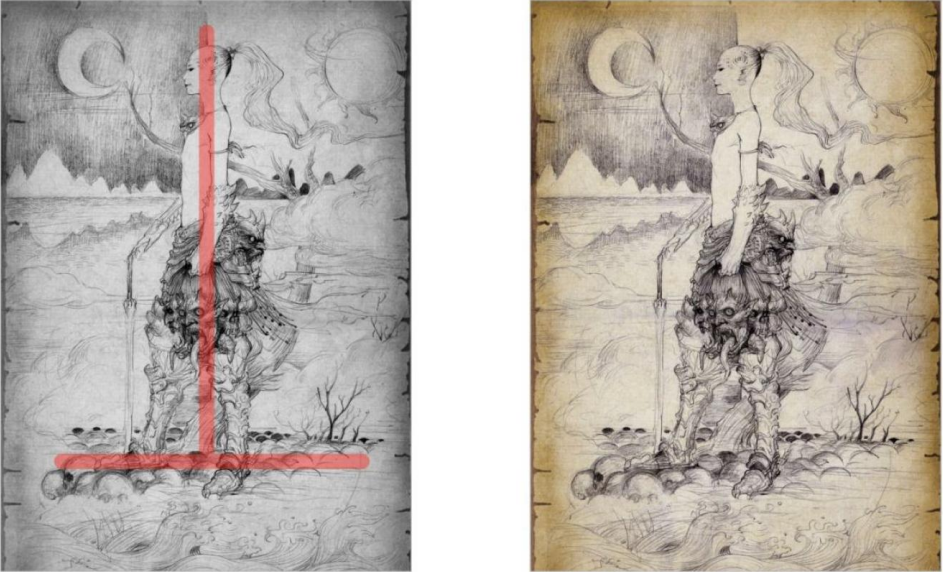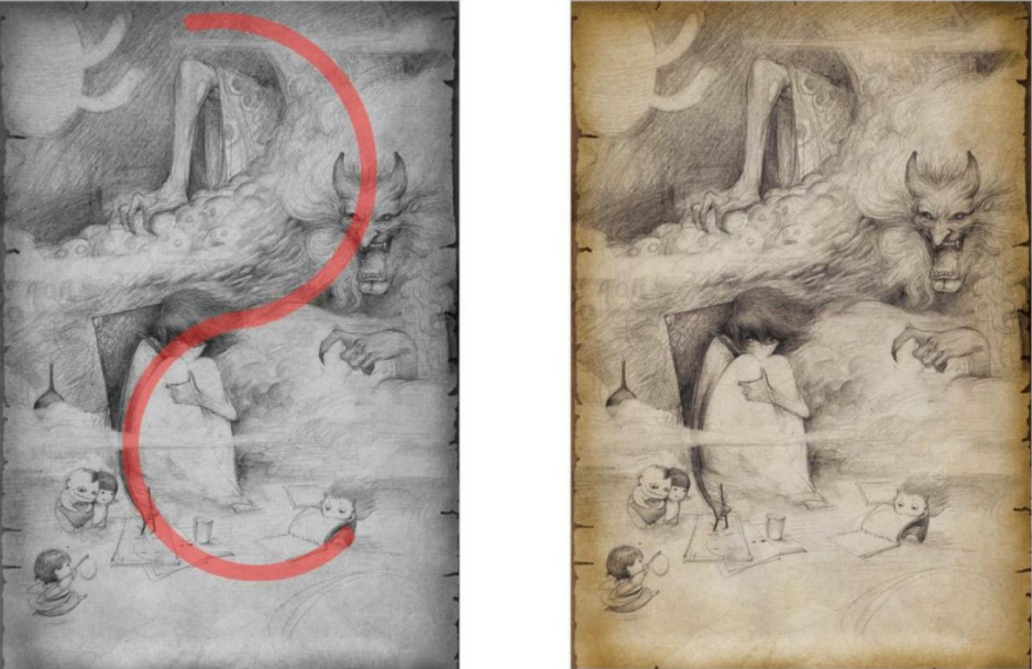 S形构图的作品画面中所呈现的基本骨架为S形,并且具有前后的纵深感,这种构图形式会给人以柔和多变的感觉。同时,构图可以很好地引导人顺着角色的眼睛来看人物,条理清晰明朗,充满趣味。