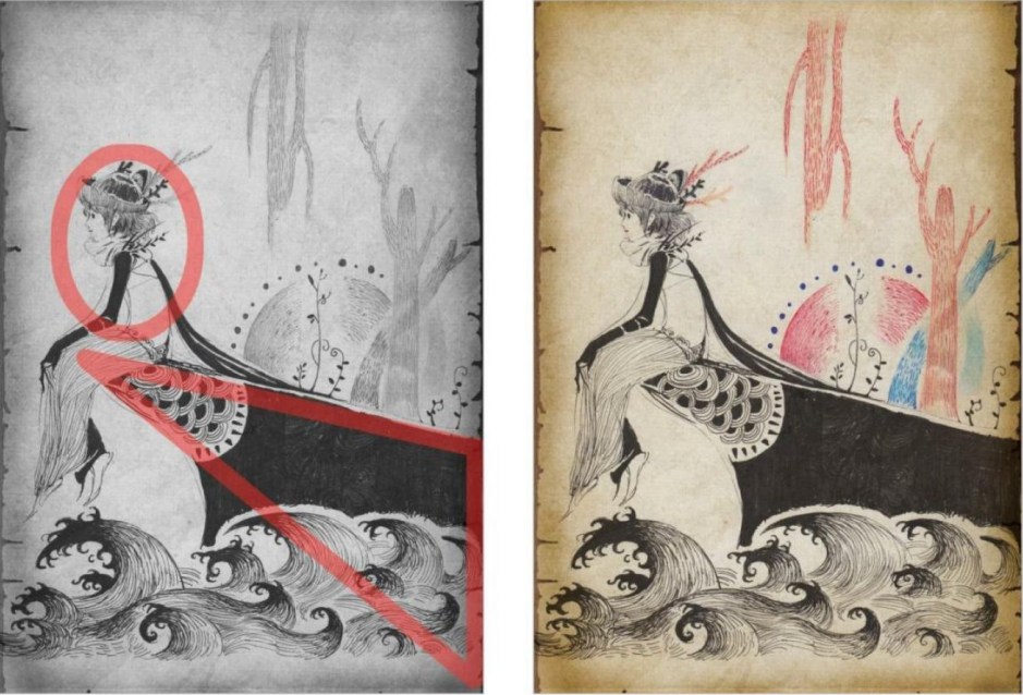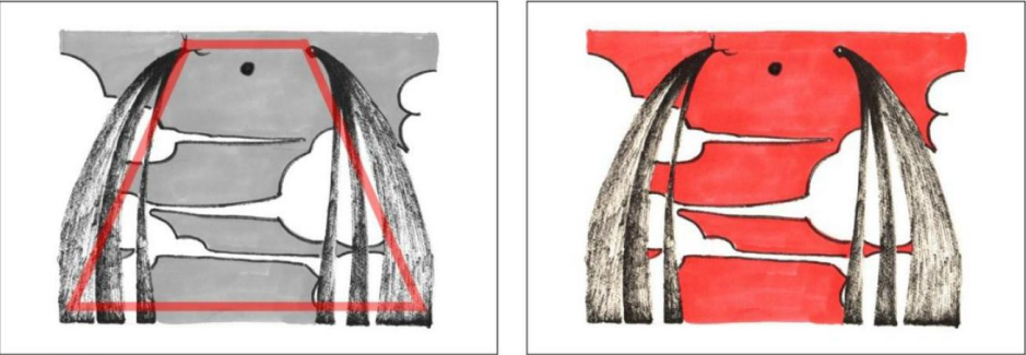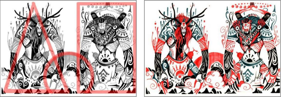 对比拓展型构图的画面采用不规则的块面和椭圆进行构图,中间以线条为依托,两个部分的绘画展现可以很好地进行相互衬托。