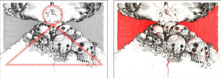 梯形对称式构图,具有平衡、稳定、相呼应的特点。同时,画面封闭压制,很容易给人一种压迫感。画面中在梯形的中间部分进行了留白处理,塑造出了空间感,因此,可以衬托出人物或大或小的体魄。