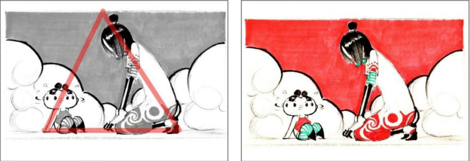 锐角三角形构图是指在三点连接的几何状态下,画面进行不同元素的展开,具有稳定性,且不失灵动。同时,可以很好地吸引观者视觉往锐角上的人物角色方向看。