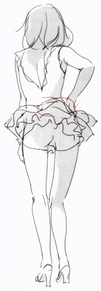 从背面观察时裙子上翘,可以看到整个臀部。蕾丝的部分使臀部的轮廓显得更加丰满。