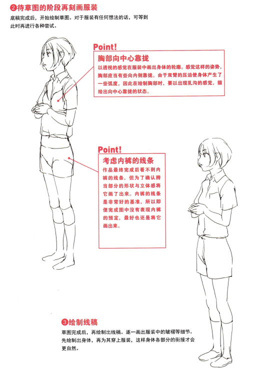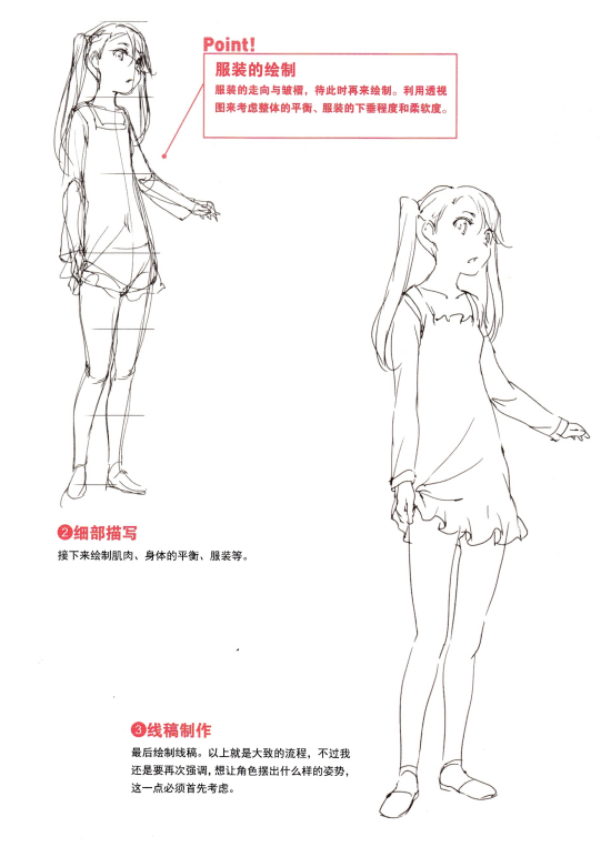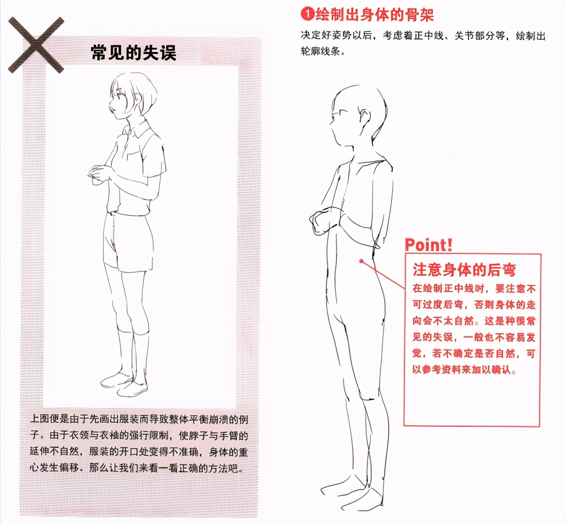遇到这种问题的人,是否总是喜欢以穿着有服装的状态来绘制人物呢?之所以平衡发生崩溃,是山于横向线条(上装与下装的分界线、衣摆或裙摆等)切断了身体的走向而引起的。的确,当熟练之后这样的方法可以有效缩短制作时间,但对于初学者来说,还是建议采用先画出裸身再为其“穿”上服装的绘画方法。
