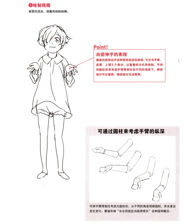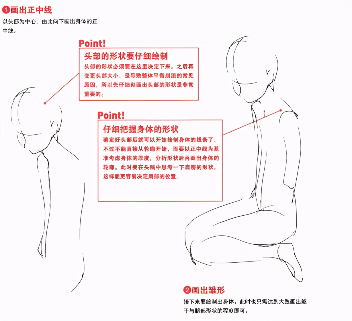 有这种状况的人,大多都是直接沿着头、肩、臂的走向来绘画。这种直接沿身体外轮廓绘画的方式非常不安定,所以不建议使用。应当更正为先决定身体的中心线画出躯干,之后再添上四肢的流程。这才是可安定有效应用的绘画方法。