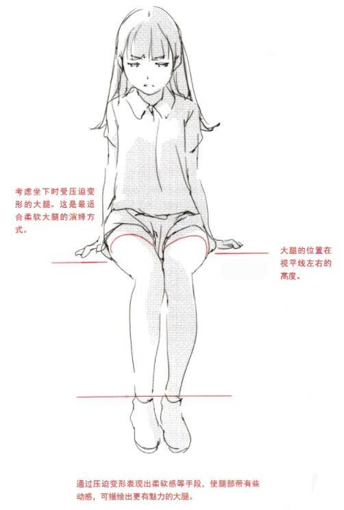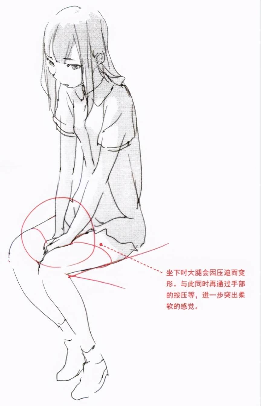 之前已经多次提到,坐下时大腿会因自身的重量而有所压迫变形。绘制出压迫变形的大腿,是表现出柔软而有魅力大腿的关键。